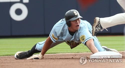 | △ (수원=연합뉴스) 박정헌 기자 = 17일 경기도 수원kt위즈파크에서 열린 ‘2015 타이어뱅크 KBO 퓨처스 올스타전’ 드림과 나눔의 경기. 드림팀 1회초 1루주자 하주석이 도루에 성공하고 있다. 2015.7.17 home1223@yna.co.kr |