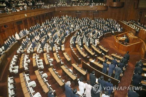 | △ 집권 자민당과 연립 여당인 공명당 의원들이 16일 오후 중의원 본회의에서 대다수 야당의원들이 퇴장한 가운데, 자위대법 개정안을 비롯한 11개 안보 관련법 제·개정안(일명 집단 자위권 법안) 표결에서 찬성 표시로 기립한 모습이다.(교도.연합뉴스) |