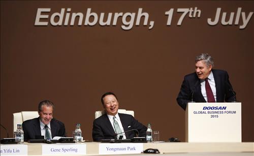 (서울=연합뉴스) 고웅석 기자 = 두산[000150]은 17일(현지시각) 영국 에든버러에서 고든 브라운 전 영국 총리, 진 스펄링 전 미국 국가경제회의(NEC) 의장, 린이푸 전 세계은행 부총재 등이 참석한 가운데 '2015 두산 글로벌 비즈니스 포럼'을 개최했다고 19일 밝혔다.