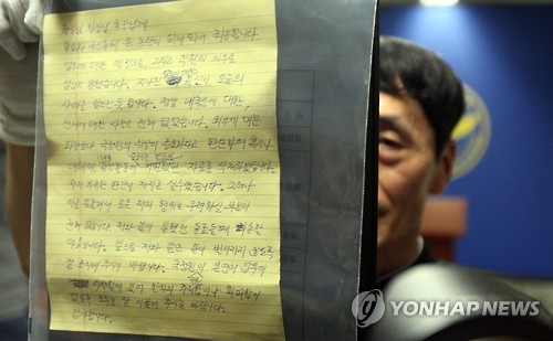 | △ "내국인에 대한, 선거에 대한 사찰은 전혀 없었습니다" (용인=연합뉴스) 최종호 기자 = 19일 오전 경기 용인동부경찰서에서 국가정보원 해킹 프로그램 구입과 관련된 유서를 남기고 숨진 국정원 직원 임모(45)씨의 유서가 공개되고 있다. 임씨는 유서에서 "지나친 업무에 대한 욕심이 오늘의 사태를 일으킨 듯하다"며 "정말 내국인에 대한, 선거에 대한 사찰은 전혀 없었다"고 밝혔다. |