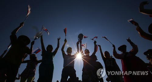 | △ 신명나는 유라시아 대축제 (이르쿠츠크<러시아>=연합뉴스) 김도훈 기자 = 19일(현지시간) 오후 러시아 이르쿠츠크 바이칼 스타디움에서 열린 유라시아 대축제에서 친선특급 단원들과 러시아 주민들이 함께 기차놀이 퍼포먼스를 즐기고 있다. 2015.7.19 superdoo82@yna.co.kr |