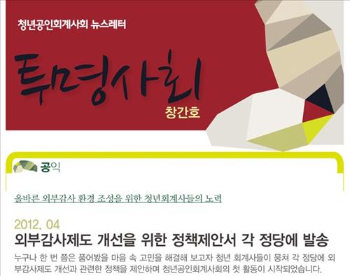젊은 회계사들의 모임인 청년공인회계사회는 온라인 소식지 '투명사회' 창간해 지난 10일 전국 회계사 1만5천명에게 발송했다고 20일 밝혔다.