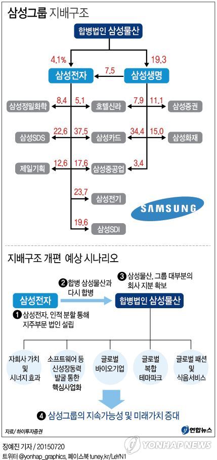 (서울=연합뉴스) 윤선희 기자 = 합병 승인으로 한고비를 넘긴 삼성그룹이 다음으로 삼성전자를 인적 분할해 지주부문을 설립하고서 다시 통합 삼성물산과 합병을 추진할 가능성이 제기됐다.