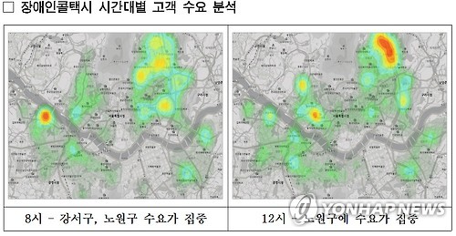 | △ 빅데이터 활용 장애인콜택시 자동배차시스템 개발 (서울=연합뉴스) 서울시와 시 산하 서울시설공단, 카이스트가 지난 5년간의 3억2천만 건 장애인콜택시 운영 빅데이터를 활용해 대기시간을 단축하는 '자동배차시스템'을 개발했다고 20일 밝혔다. 기존에는 상담원이 직접 차량을 배차하는 '수동배차' 방식이었다면, '자동배차시스템'은 똑같이 상담원이 신청을 받되 시스템에서 신청자에 맞는 차량 유무, 접수·대기 순서, 인접거리 내 가까운 차량 등을 종합 분석해 자동으로 차량을 매칭하는 방식이다. 사진은 장애인콜택시 시간대별 고객 수요를 분석한 빅데이터 자료. << 서울시 제공 >> |