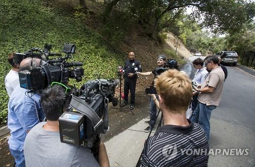 | △ 비버리힐스에 있는 데미 무어 자택 입구에서 경찰 관계자가 사건을 설명하고 있다. (AP=연합뉴스) |