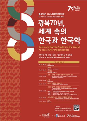 공공외교 전문 기관인 한국국제교류재단(KF)은 오는 24일 서울 웨스틴조선호텔에서 '광복 70년 기념 세계한국학대회'(KF Korean Studies Assembly 2015)를 연다고 20일 밝혔다.