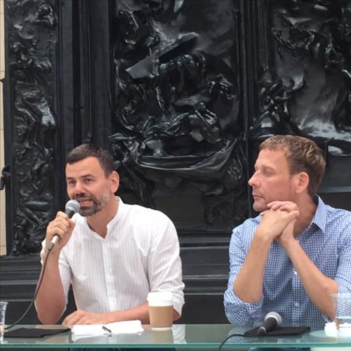 | △ (서울=연합뉴스) 김정선 기자 = 20일 삼성미술관 플라토에서 마이클 엘름그린(오른쪽), 잉가 드라그셋이 기자 간담회를 하고 있다. |