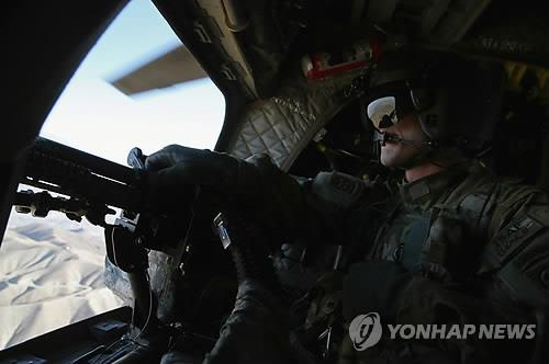 | △ 지난해 12월 척 헤이글 미국 국방장관이 아프간 동부를 방문했을 때 한 미군이 헬기에 장착된 총기를 잡고 밖을 보고 있다.(AP=연합뉴스 자료사진) |