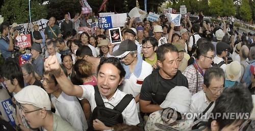 | △ (교도=연합뉴스) 2015년 7월 15일 일본 집권 자민당과 연립 여당인 공명당이 중의원 안보법제 특별위원회에서 집단자위권 등을 행사하는 안보관련법 제·개정안의 표결을 강행하자 이에 항의하는 시민들이 일본 국회의사당 근처에서 시위하고 있다. |