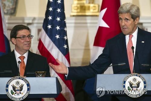 | △ 존 케리 미국 국무장관(오른쪽)과 브루노 로드리게스 쿠바 외교장관이 20일(현지시간) 미국 워싱턴DC에 쿠바 대사관 개관 행사후 기자회견을 하고 있다.(AP=연합뉴스) |