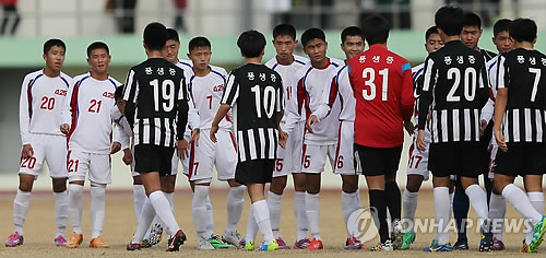 | △ 메르스가 종식될 기미를 보이자 북한이 남북한 체육교류의 빗장을 푸는 모습이다. 민족화해협력범국민협의회는 남북한이 2015 국제유소년(U-15) 축구대회를 다음달 중순께 평양에서 여는 방안을 협의하고 있다고 밝혔다. 사진은 작년 11월 경기도 연천군 공설운동장에서 열린 국제유소년축구 한국 풍생중학교와 북한 4·25체육단의 경기 모습. |