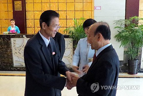 | △ 남북 민간단체가 광복 70주년 8·15 남북공동행사 개최를 논의하기 위한 사전접촉을 오는 23일 개성에서 가질 것으로 21일 전해졌다. 사진은 지난 5월 5일 중국 선양 한 호텔에서 남과 북측 준비위원회 대표단이 만나 인사를 나누고 있는 모습. 왼쪽은 북측 대표인 김완수 6·15공동선언실천 북측위원회 위원장, 오른쪽은 남측 대표인 이창복 상임대표의장. (연합뉴스 자료사진) |