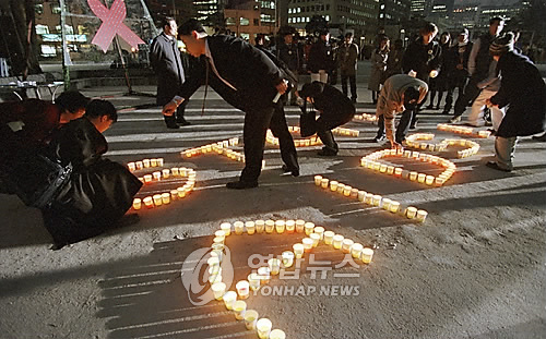 | △ 에이즈예방협회회원들이 촛불로 STOP AIDS 글자를 만들고 있다. (연합뉴스 자료사진) |