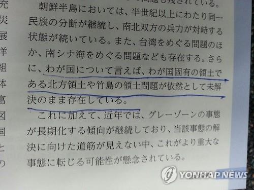 | △ 2015년 일본 방위백서에 "우리나라(일본) 고유 영토인 북방영토(쿠릴 4개섬의 일본식 표현)나 다케시마(竹島·일본이 주장하는 독도의 명칭)의 영토문제가 여전히 미해결된 채로 존재하고 있다"는 표현이 담겼다. |