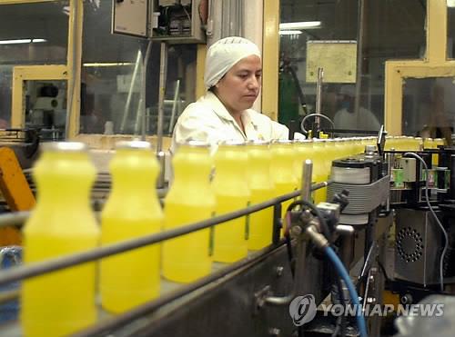 | △ 영국 공중보건국(PHE) 산하 영양과학자문위원회(SACN)는 최근 발표한 '탄수화물과 건강에 관한 최종 보고서'에서 하루 섭취 열량 가운데 추가설탕(added sugar) 섭취의 비율을 현재의 절반 수준인 5% 이하로 줄일 것을 권고했다. 사진은 오렌지주스 공장 생산라인 모습.2015.7.22 (AP=연합뉴스 자료사진) |