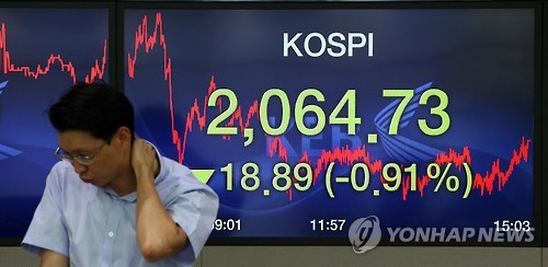 이날 코스피는 18.89포인트(0.91%) 내린 2,064.73으로 장을 마쳤다.