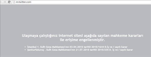 이날 오전 터키에서 트위터에 접속하면 "연결을 시도한 웹사이트는 아래 법원의 결정에 따라 차단됐다"며 테러가 발생한 샨르우르파주 수루치 법원의 결정이라는 공고문이 나왔다.