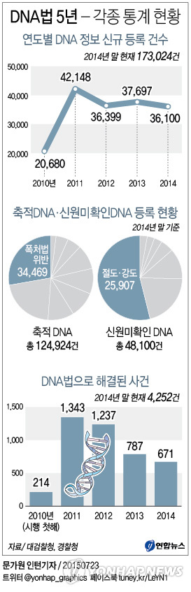 (서울=연합뉴스) 이대희 이보배 이효석 기자 = 시행 5년째를 맞은 'DNA 신원확인 정보의 이용 및 보호에 관한 법률'(DNA법)은 장기 미제사건 해결에 탁월한 실적을 올렸음에도 반대 목소리가 적지 않다.