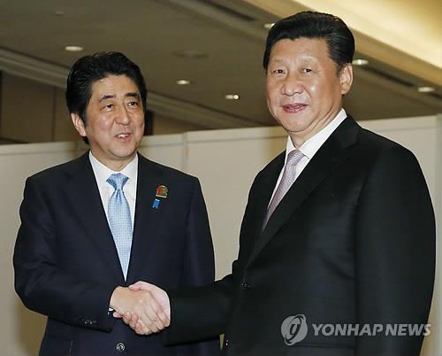| △ 4월22일 정상회담에 앞서 악수하는 시진핑(오른쪽)과 아베(AP.연합뉴스.자료사진) |