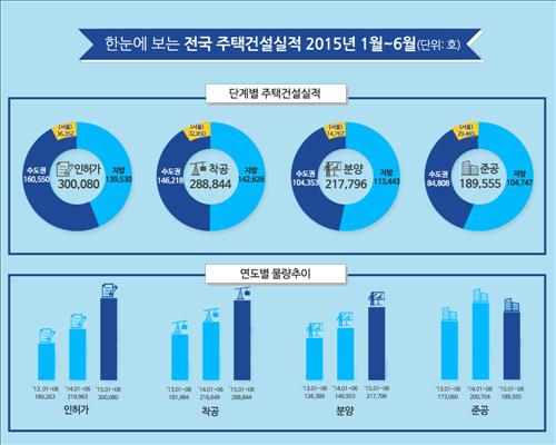 지방은 13만9천530가구로 지난해보다 8.9% 많았다. 부산이 11만603가구로 30%, 세종이 7천406가구로 92%, 제주가 7천892가구로 100% 늘어나는 등 14개 시·도 중 대구, 울산, 전남, 경남을 제외하고는 모두 작년보다 주택 인·허가 물량이 늘었다.