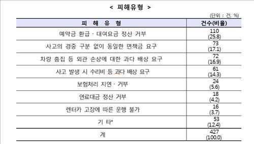 또 소비자가 자기차량손해보험에 가입하지 않은 채 렌터카를 운전하다 사고가 났을때 수리비, 손실비 등을 지나치게 요구한 경우는 61건(14.3%)으로, 이 중 19건은 100만원 이상 300만원 미만을 요구한 것으로 집계됐다.