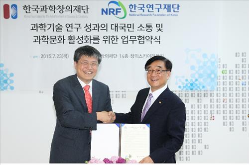 (서울=연합뉴스) 양정우 기자 = 한국과학창의재단과 한국연구재단은 23일 서울 강남구 선릉로에 있는 창의재단에서 '과학기술 연구 성과의 대국민 소통 및 과학문화 활성화'를 위한 업무협약(MOU)를 체결했다.