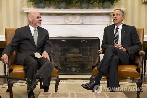 | △ 지난 3월 24일 미국 워싱턴 백악관에서 버락 오바마 미국 대통령이 미국을 방문한 아슈라프 가니 아프간 대통령과 회담하고 있다.(AP=연합뉴스 자료사진) |