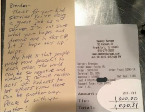 23일(현지시간) abc방송 등에 따르면 일리노이 주 프랭크포트의 식당 '스모키 바비큐'에서 종업원으로 일하는 브렌든 모틸(19)은 최근 한 남자 손님이 남겨두고 간 영수증을 확인하고 놀랐다. 밥값 20달러(약 2만3천 원)의 50배에 달하는 1천 달러(약 120만 원)를 봉사료로 지불했기 때문이다.