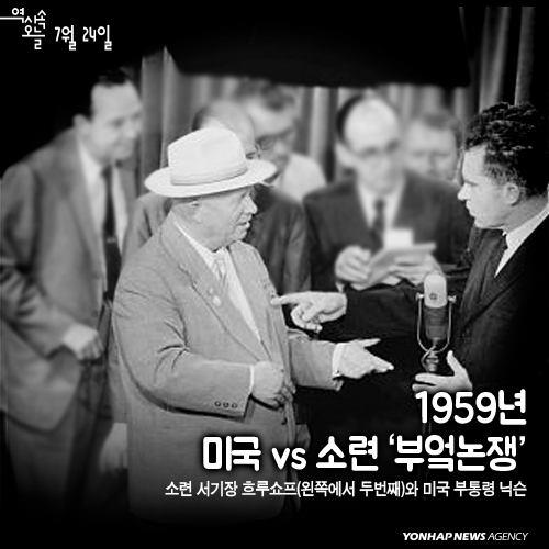 (서울=연합뉴스) 1959년 7월24일, 소련 수도 모스크바. 미국무역박람회 개막을 하루 앞두고 삼엄한 경계가 펼쳐졌다. 이날 박람회장을 찾은 사람은 리처드 닉슨 미국 부통령과 니키타 흐루쇼프 소련 공산당 서기장.