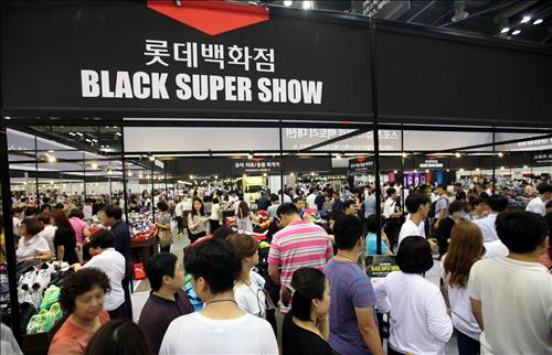 24일 롯데백화점에 따르면 킨텍스에서 23일 개막한 '롯데 블랙 슈퍼쇼(LOTTE BLACK SUPER SHOW)'의 첫날 매출은 14억원, 방문자 수는 11만명에 이르렀다.