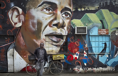 | △ 오바마 美대통령, 아버지의 나라 케냐 취임 후 첫 방문 (나이로비 AP=연합뉴스) 버락 오바마 미국 대통령이 24일(현지시간) 취임 후 처음으로 아버지의 나라 케냐를 방문할 예정인 가운데 22일 케냐 수도 나이로비에 오바마 대통령의 얼굴을 그린 대형 벽화가 보인다. marshal@yna.co.kr |