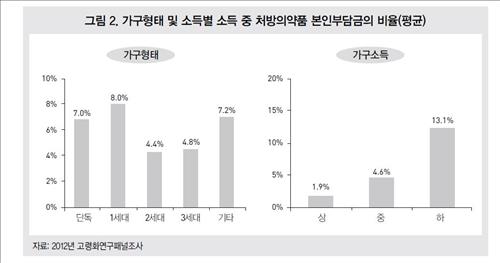 소득 수준에 따라 상-중-하로 삼등분했을 때 '상'에 속하는 고소득층 노인이 약값으로 소득의 1.9%만 지출하는 것과 비교하면 6.9배나 차이가 났다.