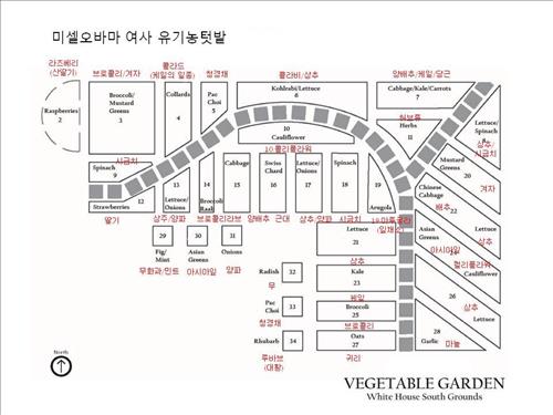 백악관 남쪽에 있는 미셸 여사의 텃밭은 140㎡ 규모다. 상추와 마늘, 양배추, 청경채 등 26종의 유기농 채소가 종류에 따라 상자식으로 구분돼 재배되고 있다.