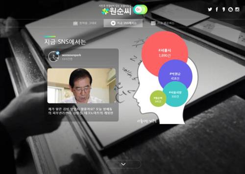 소셜시장실 '#원순씨 ON'이란 이름으로 바뀌는 새 홈페이지(mayor.seoul.go.kr)에는 시민이 자신의 사회관계망서비스(SNS)에 '서울시', '박원순', '서울시장', '원순씨' 등 서울시와 관련된 특정 단어에 해시태그(#)를 붙여 올린 내용이 실시간으로 나타난다.