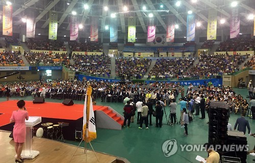 | △ 지난 14일 경기도 수원시 수원체육관에서 열린 '군공항 이전 수원 시민협의회' 발대식. 시민협의회는 군공항 이전 사업의 원활한 진행을 돕고자 1천100명의 전문가 및 시민으로 구성된 민간조직으로 지난 5월 발족했다. <연합뉴스 자료사진> |