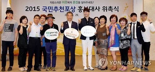 | △ 정종섭 행정자치부 장관(왼쪽 여섯째)이 정부서울청사에서 국민추천포상 홍보대사에 산악인 엄홍길(왼쪽 다섯째)씨와 방송인 박수홍 (왼쪽 일곱째)씨를 위촉한 후 생활공감정책 모니터단 및 서포터즈들과 기념촬영을 하고 있다. (연합뉴스 자료사진) |