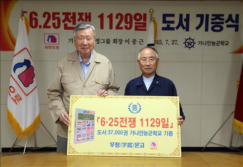 이 회장은 김평일 가나안농군학교장과 이날 중구 서소문동 부영빌딩에서 도서 기증식을 열고 '6·25 전쟁 1129일' 요약본 3만 2천권과 영문판 5천권을 기증했다.