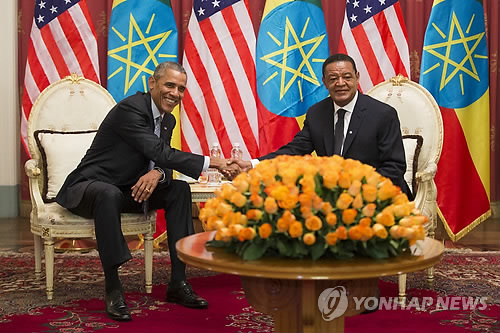| △ 오바마, 미국 대통령으로는 첫 에티오피아 방문 (아디스아바바 AP=연합뉴스) 버락 오바마 미국 대통령이 27일(현지시각) 에티오피아 수도 아디스아바바 궁전에서 물라투 테쇼메 에티오피아 대통령과 악수하고 있다. ciy@yna.co.kr |