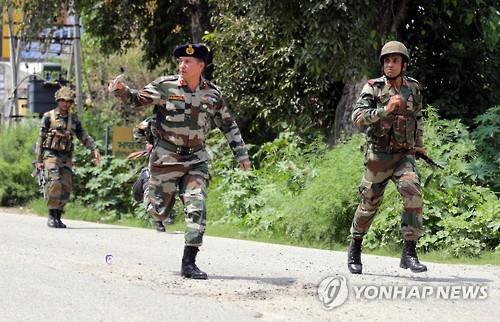 | △ 27일 인도 펀자브 주 구르다스푸르에서 인도군인들이 달려가고 있다.(EPA=연합뉴스) |