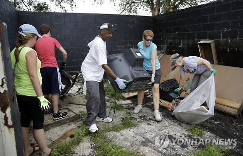 | △ 미국 '흑백 갈등'의 진앙인 미주리 주 퍼거슨 시에서 27일(현지시간) 수 백명의 인원이 자발적으로 참여한 가운데 도심 청소 작업이 벌어졌다. 이들은 지난 1년간 거듭된 시위 탓에 폐허로 변한 도심에서 쓰레기를 수거했다. (AP=연합뉴스) |