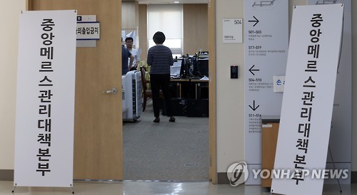 | △ 재편되는 중앙메르스관리대책본부 (세종=연합뉴스) 배재만 기자 = 정부가 사실상 중동호흡기증후군(메르스) 종식 선언을 한 28일 정부세종청사 보건복지부 내 중앙메르스관리대책본부에서 직원들이 바쁘게 출입하고 있다. 보건복지부는 그동안 중동호흡기증후군(메르스) 관련 상황을 총괄하던 '중앙메르스관리대책본부'를 메르스 상황실과 메르스 후속조치TF로 재편한다고 밝혔다. |