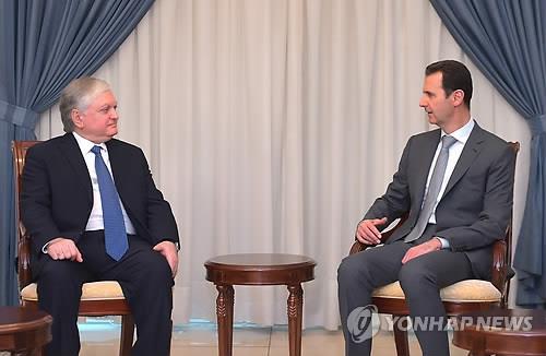 | △ 바샤르 알아사드 시리아 대통령(오른쪽)이 지난 5월 27일 다마스쿠스에서 에드워드 날반디안 아르메니아 외무장관을 접견하고 있다.(자료사진) |