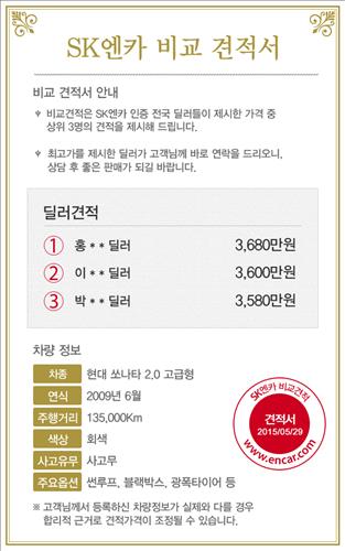 지금까지는 타던 차를 팔 때 여러 딜러에게 일일이 가격을 문의하거나 협상하는 복잡한 거래 과정을 거쳐야 했지만 비교견적 서비스를 이용하면 전화 한 통으로 여러 딜러가 써낸 가격을 비교해 최고가에 간편하게 판매할 수 있다고 SK엔카는 설명했다.