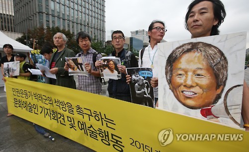 | △ 인권운동가 박래군 석방촉구 문화예술인 기자회견 (서울=연합뉴스) 임헌정 기자 = 문화예술계 관계자들이 29일 서울 종로구 광화문 광장에서 '인권운동가 박래군의 석방을 촉구하는 문화예술인 기자회견 및 예술행동'을 하고 있다. 2015.7.29 kane@yna.co.kr |