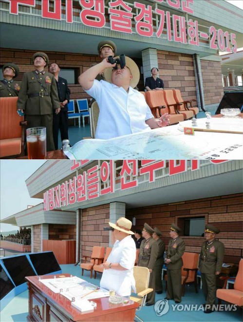 | △ 쌍안경 들여다보는 김정은 (서울=연합뉴스) 북한에서 '전승절'로 기념하는 정전협정 체결 62주년을 맞아 원산 갈마비행장에서 인민군 항공 및 반항공군 지휘관 전투비행술 경기대회가 열렸다. 노동신문은 김정은 국방위원회 제1위원장이 이 대회를 현지 지도했다고 30일 보도했다. 2015.7.30 nkphoto@yna.co.kr |