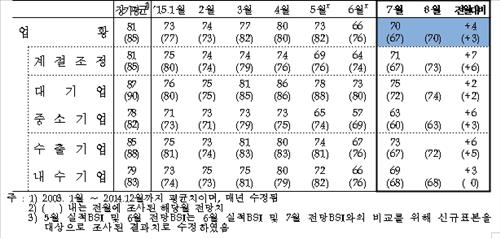 8월 업황 전망 BSI는 70으로 조사돼 6월에 조사했던 7월 전망치(67)보다 3포인트 올랐다.
