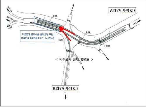 (서울=연합뉴스) 황희경 기자 = 서울 이수고가에서 빈번하게 발생하는 불법 차선 변경을 막고자 사평로·사당로의 합류 구간에 중앙분리대가 설치된다.