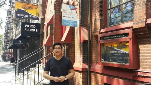 | △ (뉴욕=연합뉴스) 이강원 특파원 = 일본군 위안부를 소재로, 한국인이 제작한 첫 창작 뮤지컬 '컴포트 우먼'(위안부)이 오는 31일(현지시간) 미국 뉴욕 맨해튼 오프브로드웨이 극장 '세인트 클레멘트'에서 막을 올린다. 사진은 연출자 김현준(24)씨가 극장 앞에 서있는 모습. |