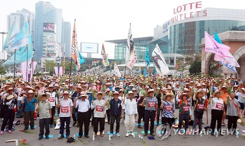 | △ 서울역 광장 앞 농민들 (서울=연합뉴스) 박동주 기자 = 31일 오후 서울역광장에서 열린 밥쌀용 쌀 수입저지 전국농민대회에서 참가자들이 밥쌀 수입 중단을 촉구하고 있다. 2015.7.31 pdj6635@yna.co.kr |