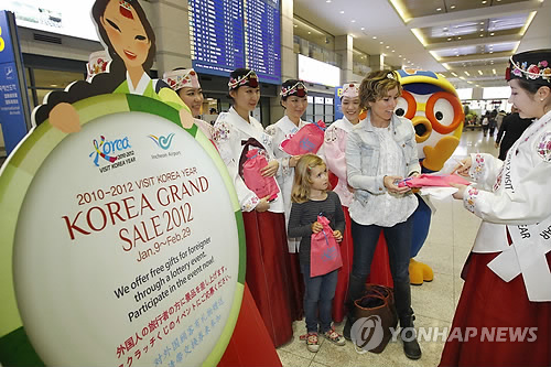 | △ 지난 2012년 '코리아그랜드세일' 행사 일환으로 홍보 관계자들이 외국인 입국자에게 이벤트 선물 등을 전달하고 있다. (연합뉴스 자료사진) |
